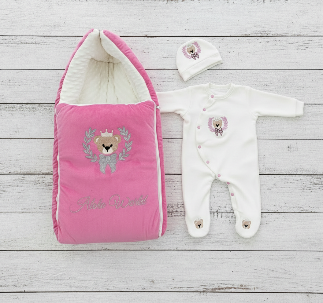 Introducing our beautiful elegant baby starter set, thoughtfully designed to meet all your little one's needs while ensuring they look stylish. This exquisite set features a beautifully embroidered baby carry nest, a soft and comfortable romper, a matching cap, all crafted with care and attention to detail. Perfect for both everyday use and special occasions, this starter set combines functionality with a touch of luxury, making it an ideal choice for any new parent looking to provide comfort and elegance for their baby