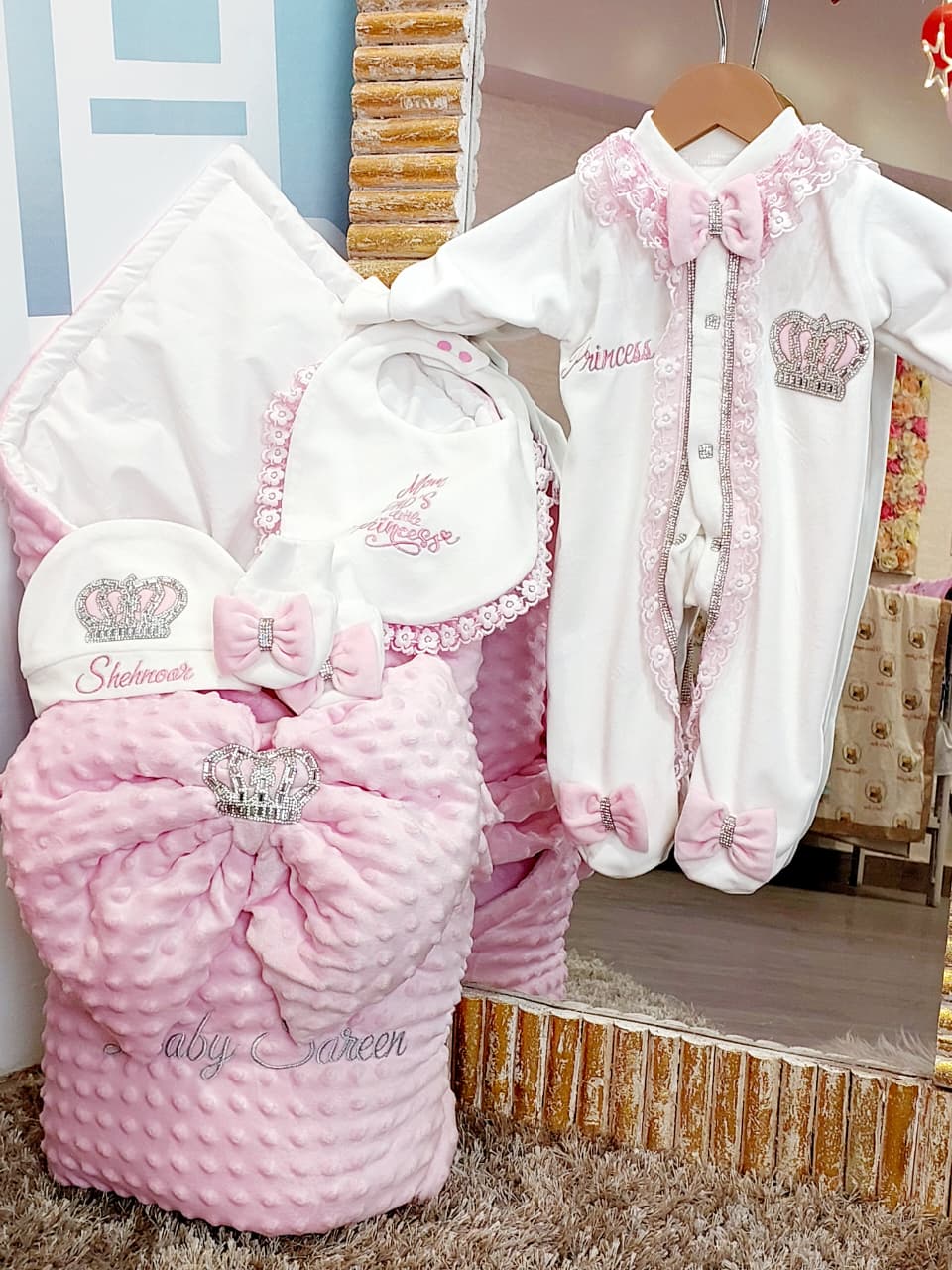 Introducing our beautiful elegant baby starter set, thoughtfully designed to meet all your little one's needs while ensuring they look stylish. This exquisite set features a beautifully embroidered baby carry nest, a soft and comfortable romper, a matching cap, all crafted with care and attention to detail. Perfect for both everyday use and special occasions, this starter set combines functionality with a touch of luxury, making it an ideal choice for any new parent looking to provide comfort and elegance for their baby.