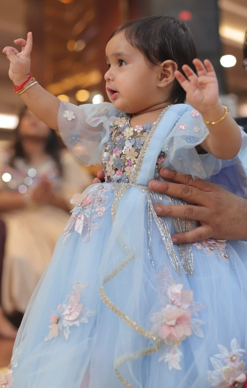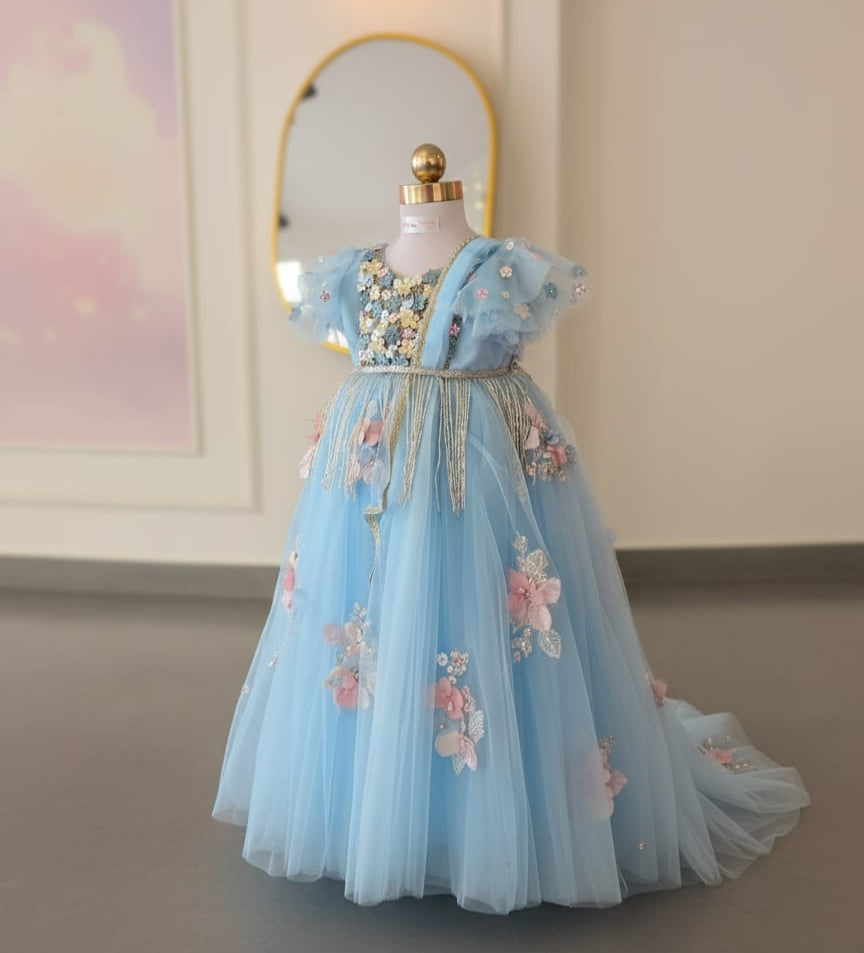This is a beautiful light blue party dress for a child, displayed on a mannequin. It has a shimmering, iridescent quality to the fabric, which gives it a luxurious sheen.