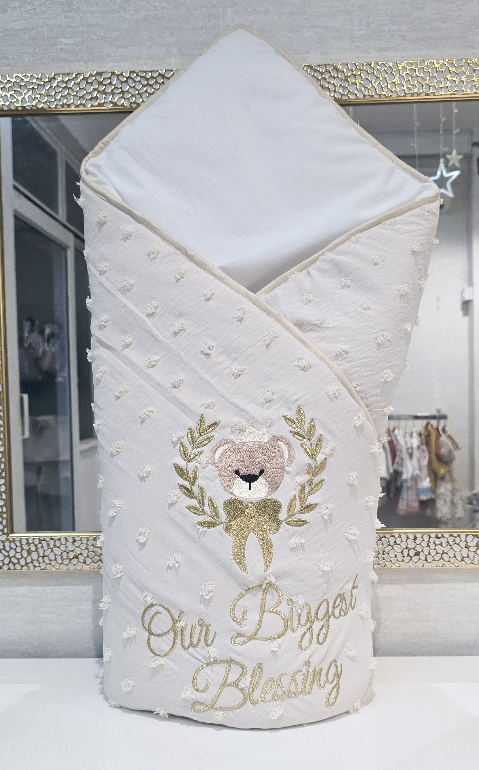 Each piece is thoughtfully adorned with delicate lace, subtle embroidery, or signature Baby Casa motifs, making it a perfect companion for rituals and celebrations where your baby is the star.