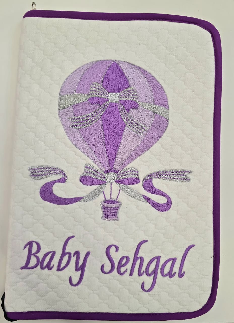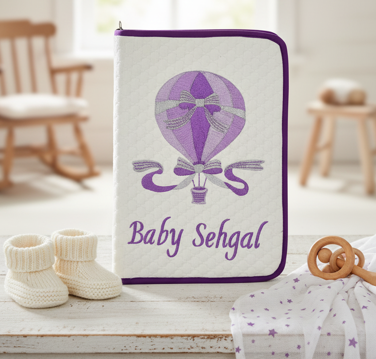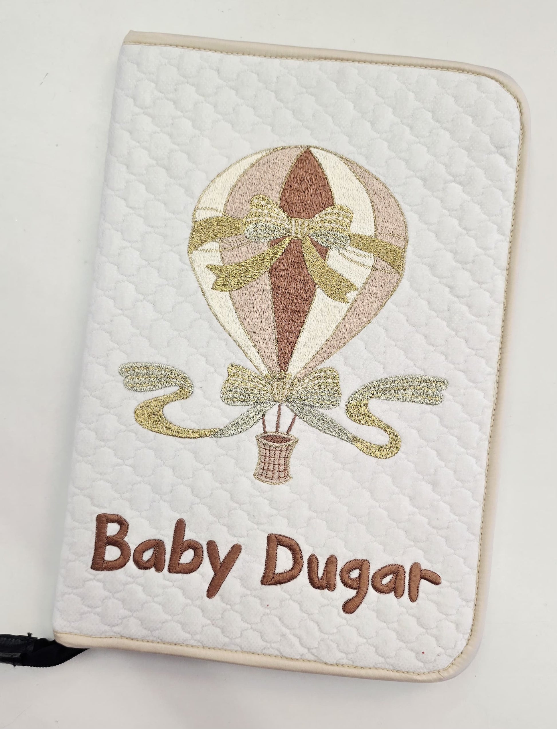 Presenting a beautifully crafted, personalized baby memory book perfect for documenting your little one's journey. This elegant folder features a cream-colored quilted cover with a charming hot air balloon embroidery adorned with shimmering gold and blush ribbons. Customized with the name "Baby Dugar" in rich brown thread, this keepsake is showcased in a bright, airy nursery setting alongside tiny white booties and a wooden teether. It's an exquisite, timeless piece to hold your dearest memories.