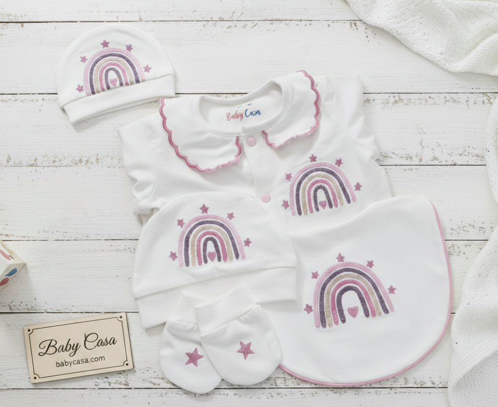 The set includes a romper , cap , mittens and bib.
